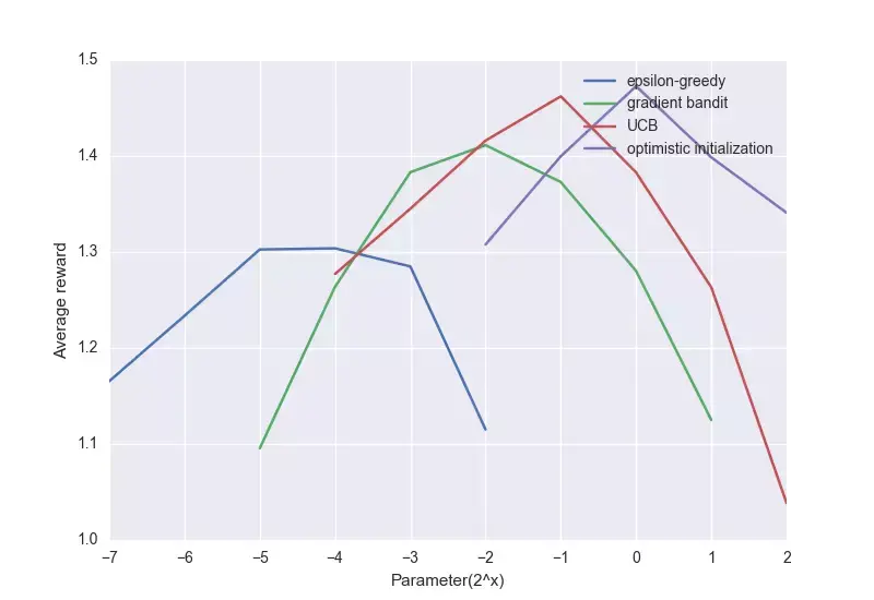 时,智能体就开始贪婪了。换句话说,假设我们设当前拉杆的乐观回报是3,但它实际上最高能获得的回报只有2.5,智能体尝试一次后,发现回报只有1,低于乐观值,于是它会把其他拉杆全部尝试一遍。虽然前期效率很低,但到后期,智能体已经掌握哪些拉杆会产生高值,效果就接近“贪婪”了。