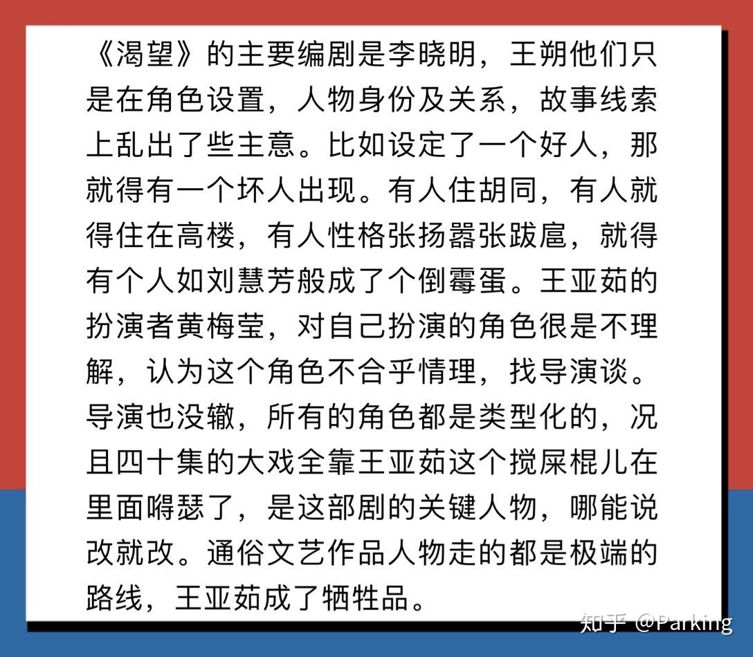 大意就是,编剧的过程是模式化的,只有极度的好和坏,“大爱”和“极度善良”是公式化的结果,而不是对人性思考的结果,所以人物是扁平的,像慧芳那样善良到没道德瑕疵的人是违背现实和常识的,连演员都觉得“不合情理”,